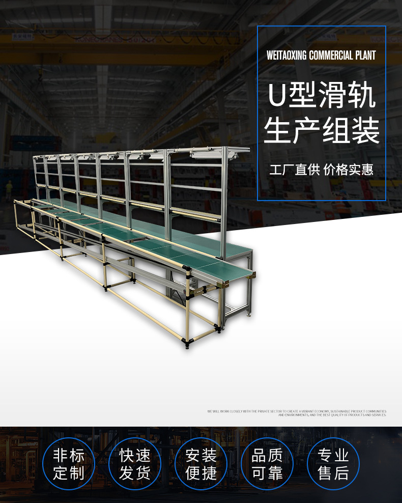 自動(dòng)化生產(chǎn)流水線工作臺(tái)在產(chǎn)品加工生產(chǎn)中的作用是作為操作平臺(tái),即用于工作人員完成產(chǎn)品的裝配、包裝等操作。它的結(jié)構(gòu)形式也因使用環(huán)境和行業(yè)不同會(huì)有不同的設(shè)計(jì),工作臺(tái)的結(jié)構(gòu)樣式,我們可以參考它的分類。我們可以將常見的工作臺(tái)進(jìn)行簡(jiǎn)單做如下分類1、獨(dú)立工作臺(tái):即一個(gè)工作臺(tái)獨(dú)立作為一個(gè)操作平臺(tái);2、防止