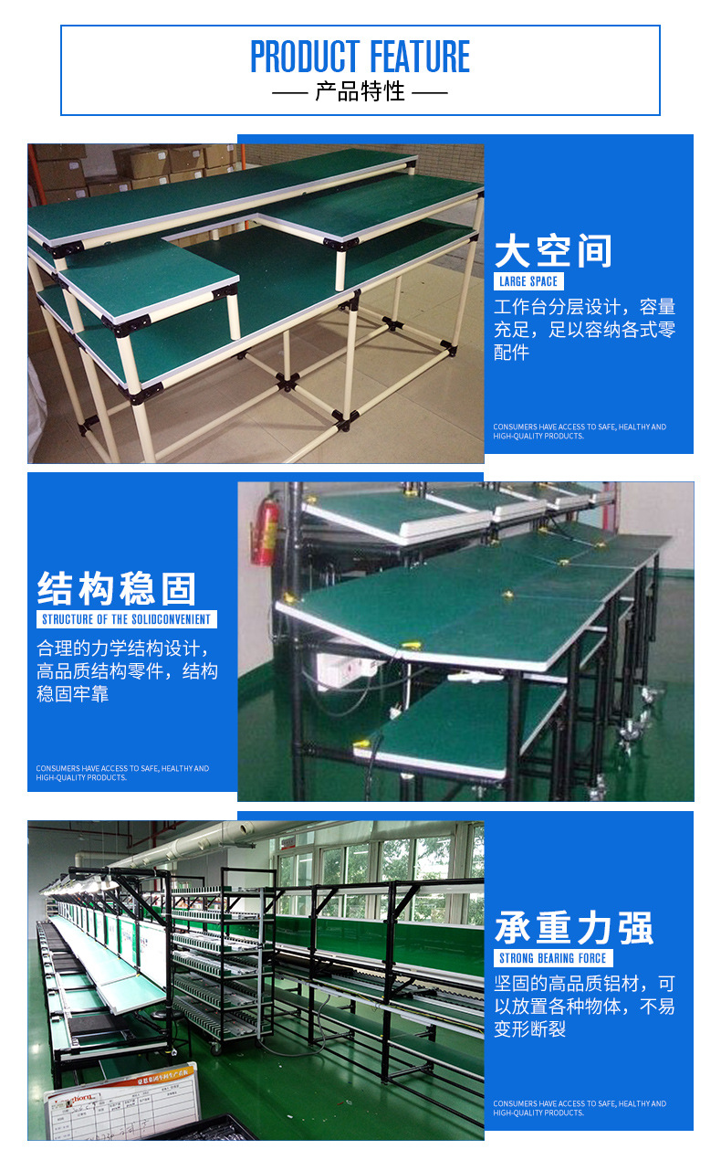 自動(dòng)化生產(chǎn)流水線(xiàn)工作臺(tái)在產(chǎn)品加工生產(chǎn)中的作用是作為操作平臺(tái),即用于工作人員完成產(chǎn)品的裝配、包裝等操作。它的結(jié)構(gòu)形式也因使用環(huán)境和行業(yè)不同會(huì)有不同的設(shè)計(jì),工作臺(tái)的結(jié)構(gòu)樣式,我們可以參考它的分類(lèi)。我們可以將常見(jiàn)的工作臺(tái)進(jìn)行簡(jiǎn)單做如下分類(lèi)1、獨(dú)立工作臺(tái):即一個(gè)工作臺(tái)獨(dú)立作為一個(gè)操作平臺(tái);2、防止